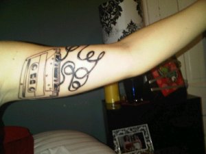 This is Calley’s new tattoo. She loves music and the sentiment of mixed tapes. She is not a fan of strapless dresses, conservatism, or her sisters’ opinions. Actually, she was trying to distract from the chaos of our other sisters lives. Love you Calley!