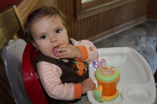 | Amelia’s first Thanksgiving…tiny bits of ham and a jar of squash. |