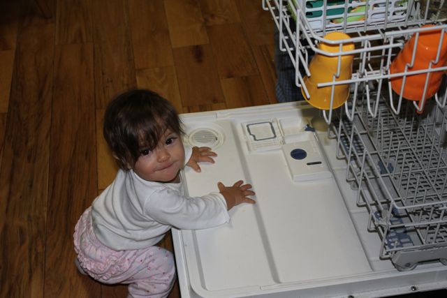 At nine months, I have introduced her to the simple pleasures of life like ice cream…and the never ending drudgery of such tasks as dishes.  For now she finds the dishwasher an intriguing contraption with the allure of denial.  As in, she’s not supposed to play in it, so of course that’s the only place she wants to be when it’s open.