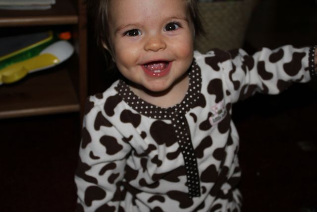 She thinks her name is Millie-Moo (the danger of nicknames) and her sisters are the greatest. She knows how to please (last night she said “granddad” to Joshua’s grandfather) and how to wave ‘bye. She’ll problem solve to get that toy she wants, if her sisters will leave her alone long enough to do it. And she’s growing faster than I can sort through the hand-me-downs. (17 lbs, 28″ at our last appt.)