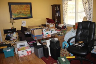 | This is all the junk we took out of the office so we could take down our existing furniture and replace it with some sleekly modern IKEA finds. This picture scares me even though all this isn’t still in the living room.