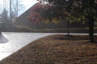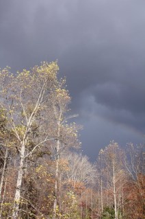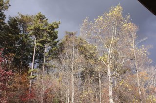 The sky out my front storm door was streaked with blues and sunbeams danced through the clouds. But out back the view from my kitchen sink where I was washing the mixing bowls and scrubbing dried breakfast eggs, the sky was darkly ominous…except the sun was still shining on the trees.
