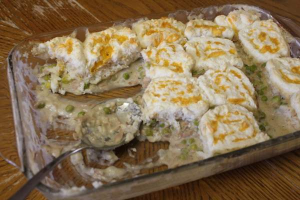 This is Tuna Bake with Cheddar Cheese Biscuits from Jane over at Thy Hand Hath Provided.  Joshua gave me her cookbook for Valentine’s Day and we’re trying new things.  Verdict?  A great success with all the kids and even the daddy, who doesn’t love tuna.  I used 4 cans instead of the 2 called for and made my biscuits from scratch.  I also used homemade cream soup substitute and frozen peas and homemade baking mix…..otherwise it was exactly the same as hers 🙂
