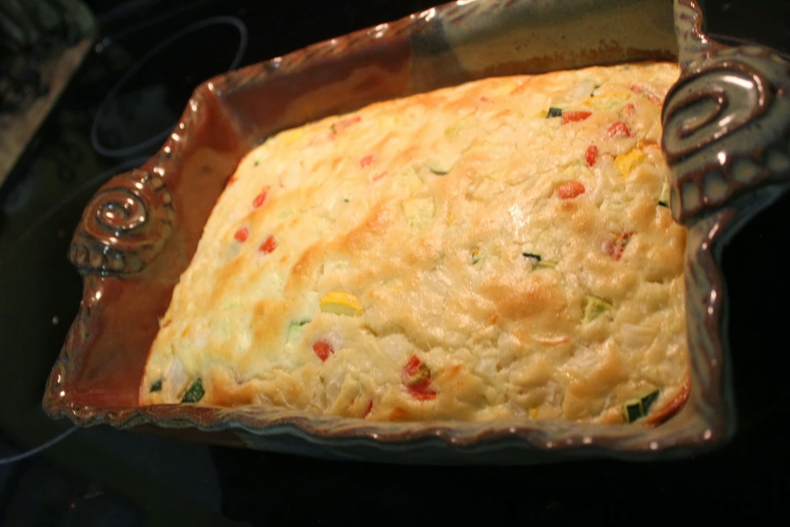 Put ingredients in blender and process until smooth, about 15 seconds. Pour over vegetables. Bake at 400 degrees 30-40 minutes, until knife inserted in center comes out clean. (If you have a lot of tomatoes with extra juice, it will take longer to set. Tent with foil if top is browning too much.)