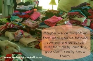 Maybe we’ve forgotten what it is to have a community. Maybe we’ve forgotten that until you’ve helped someone else scrub out their dirty laundry, you don’t really know them. Maybe we’ve forgotten that until we’ve shared that we’re not always perfect and sometimes there are stains that only fade and never go away, we can never really be accepted.