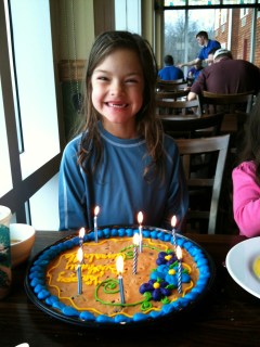 So she did. After a dinner from the buffet, we cut up that cookie cake and plated it on salad plates her baby sister kept fetching from the bar. She walked all around that sparsely populated restaurant and my shyest child asked folks if they would like some cookie cake because it was her birthday. They were a little astounded. A little flustered at the thought of saying no. A lot joyful at the idea that a child could exhibit selflessness.