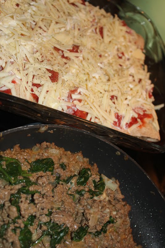 In a large pan, brown the ground beef. Sprinkle with taco seasoning while browning. Drain and set aside. In the same pan, saute spinach. Set aside with beef. Melt butter in the pan and whisk in flour until smooth. Gradually add milk, stirring constantly until smooth on medium heat. When mixture thickens, add back in the beef and spinach. Stir well to combine. Season with salt and pepper (or more taco seasoning) to taste.